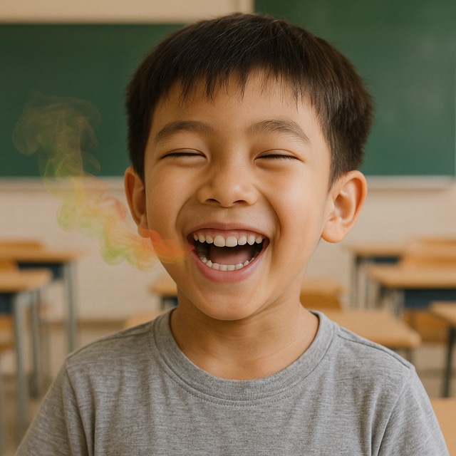 학교에서 초등학생 남자아이가 입에서 입냄새를 내뿜는 모습(출처: 자체제작)
