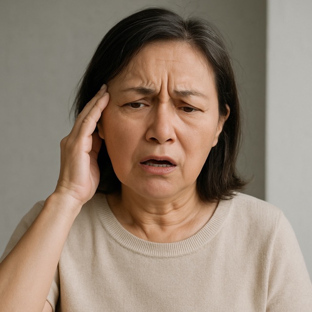 갑작스럽게 말이 어눌해져 당황한 표정의 중년 여성, 뇌졸중 초기 증상을 의심하는 모습(출처: 자체제작)