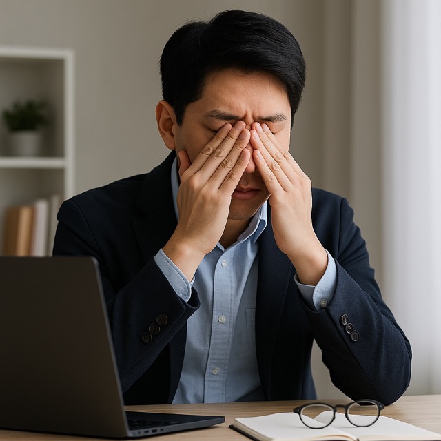 장시간 컴퓨터 작업 후 눈의 피로를 느끼며 눈을 감싸고 있는 직장인(출처: 자체제작)