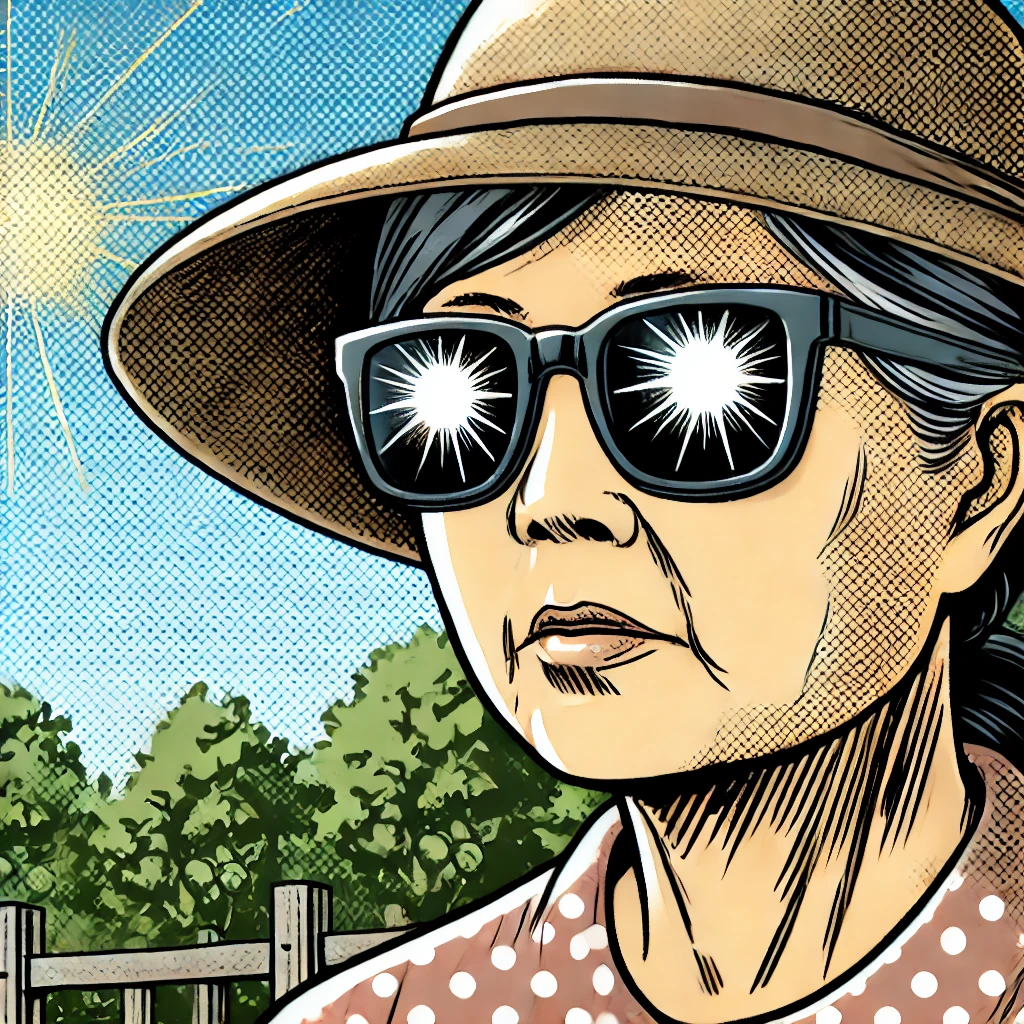 자외선 차단을 위해 선글라스와 모자를 착용한 노인 여성 (백내장 예방 강조)