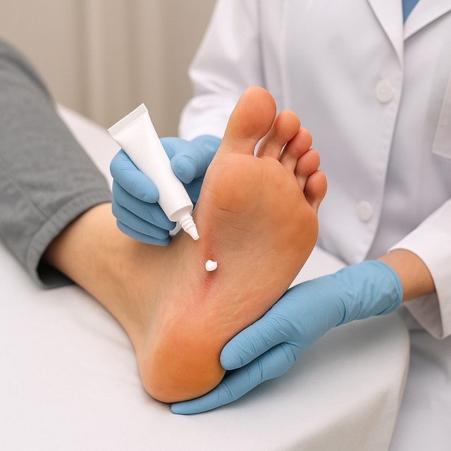무좀 의심 증상이 보인다면 약국에서 판매하는 항진균제 연고를 사용해보세요.